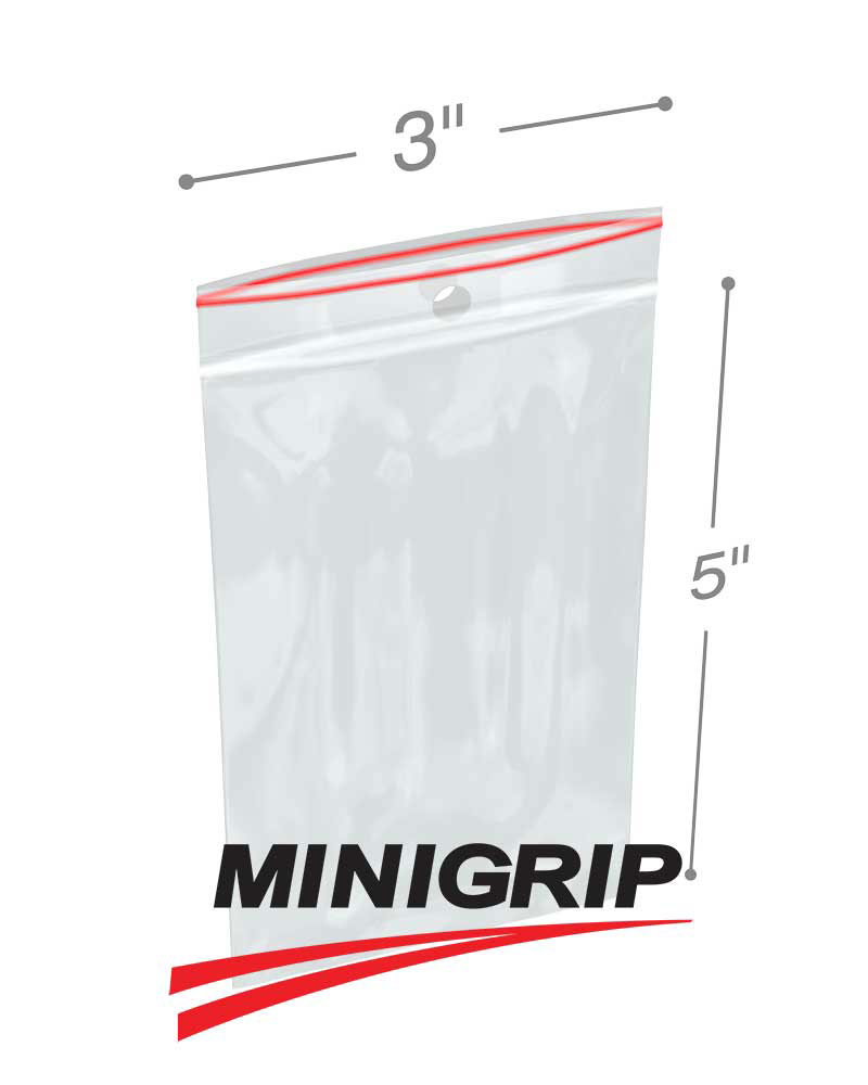 These 6" x 8" 4-mil resealable plastic bags with hang hole feature the color red line, which stands for the highest quality plastic resealable bags in the packaging industry. These 6 in. x 8 in. 4 mil reclosable plastic bags with hanging hole are perfect for display stands or for more efficient storage and better product presentation of your items. These 6 inch x 8 inch .004 Minigrip reclosable poly bags with hang holes can be recycled to help protect the environment and save you money. All 6x8 4mil Minigrip poly bags with hanging hole are manufactured with 100% virgin resins, meets USDA/FDA requirements for food contact.