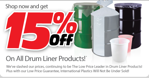 | Shop now and get 15% Off on All Drum Liners, Drum Covers and Drum Cap Sheets we have in Stock! We've slashed our prices, continuing to be the Low Price Leader in Drum Liner Products! Plus with our Low Cost Guarantee, International Plastics will Not Be Undersold! Eliminate the need for drum cleaning! These polyethylene drum liners and rigid pail liners are found in areas where industrial packaging of paints, chemicals, pharmaceutical products and many more items are used or disposed of. Rigid Drum Liners or Drum Inserts are vacuum formed and are constructed without any seams. Choose from 5-gallon, 30-gallon, or 55-gallon drum liners. We supply drum liners for all types of industries including: Industrial, Chemical, Electronic, Military, Pharmaceutical, Commercial, Agriculture, Food, and Medical. Order online now or request a quote! |