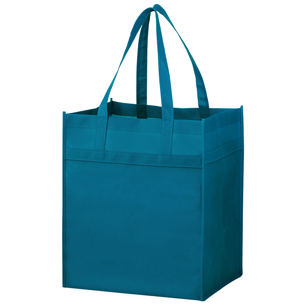 12 x 8 x 13 + 8 Black Non Woven Grocery Tote Bag is a very popular style of grocery bag! These bags are made from 80 GSM non-woven polypropylene (Recyclable #5) and utilize 22" reinforced sewn handles, a hemmed opening, and stitched seams in the sides and bottom gusset. 12" x 8" x 13" + 8" Black Non Woven Tote feature a rigid polyboard made of recycled plastic for extra strength.